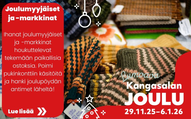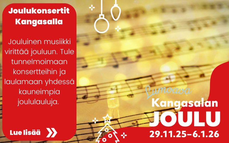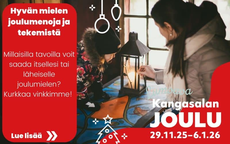 Joulusivumme on vinkkejä ja ideoita tarjoava oppaasi Lumoavaan Kangasalan jouluun! Tule tunnelmoimaan konsertteihin, hanki jouluherkut tai löydä paikalliset lahjat pukinkonttiin myyjäisistä ja markkinoilta, sekä fiilistele joulua monissa tapahtumissa.