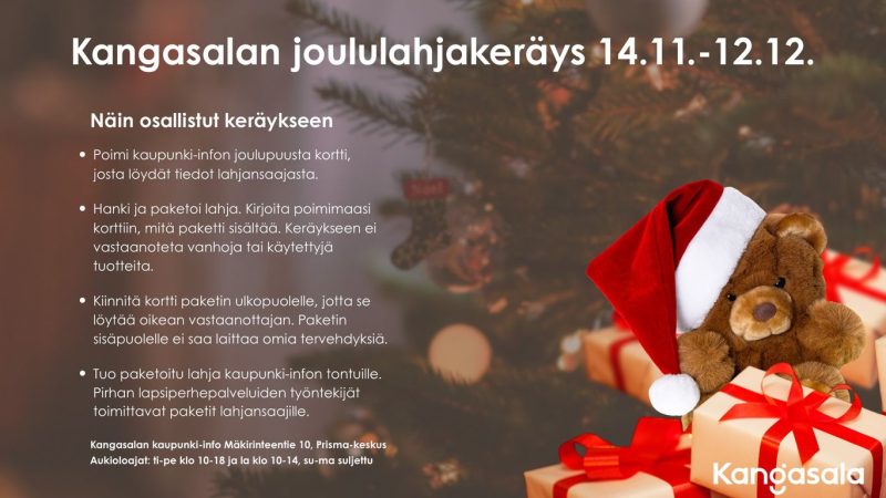 Jo perinteeksi muodostunut Kangasalan kaupungin joululahjakeräys järjestetään 14.11.-12.12. Sen avulla joulun tunnelmaa välitetään kangasalalaisille lapsille. Keräys toteutetaan yhteistyössä Pirhan eteläisen alueen lapsiperhepalveluiden kanssa. Kangasalan kaupunki-info toimii joululahjakeräyksen tapahtumapaikkana.